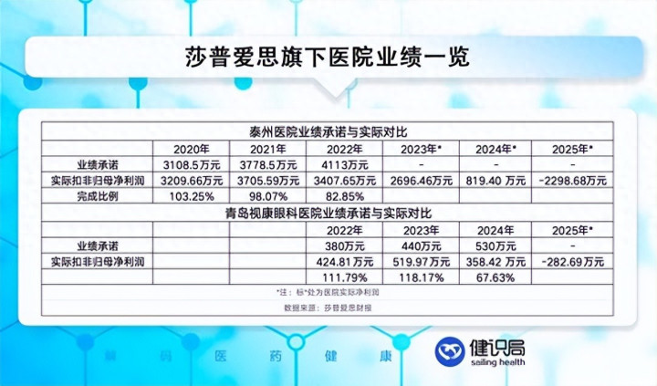 2020年,莎普爱念念收购妇产儿童病院泰州病院,2023年又收购青岛视康眼科病院。但这条转型路并没走得手。对赌期内,泰州、青岛的两家病院都未完成其功绩得意,强迫完成了90%得意的累计净利润。对赌扫尾后,速即就背离了莎普爱念念的期许。2025年,泰州病院、青岛视康两家均由盈转亏,净蚀本鉴别达到2298.68万元和282.69万元,甚而使公司功绩进一步恶化。