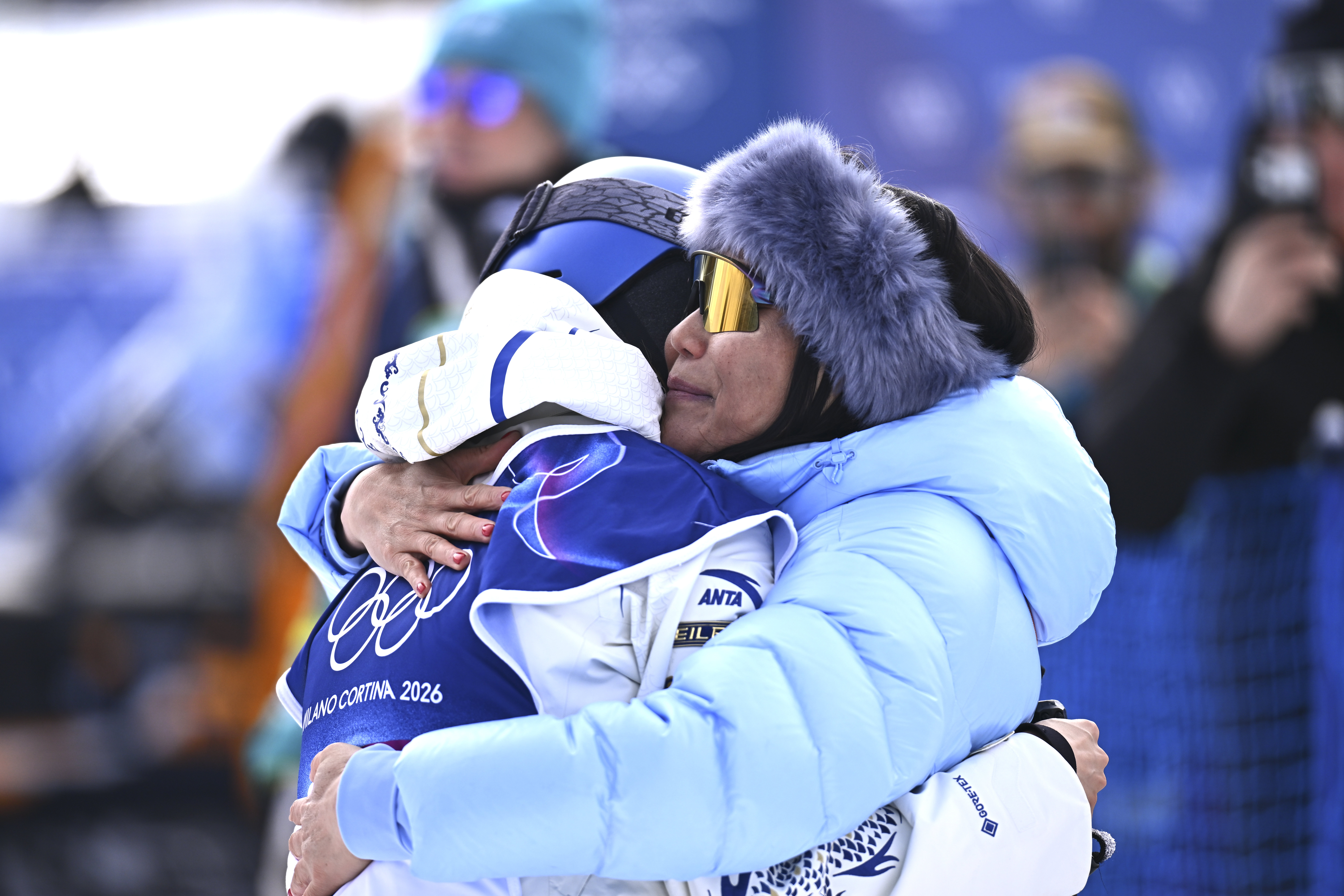 2月9日,中国选手谷爱凌(左)在完成解放式滑雪女子坡面欺压手段决赛第一跳后和母亲拥抱。新华社记者 张宏祥 摄