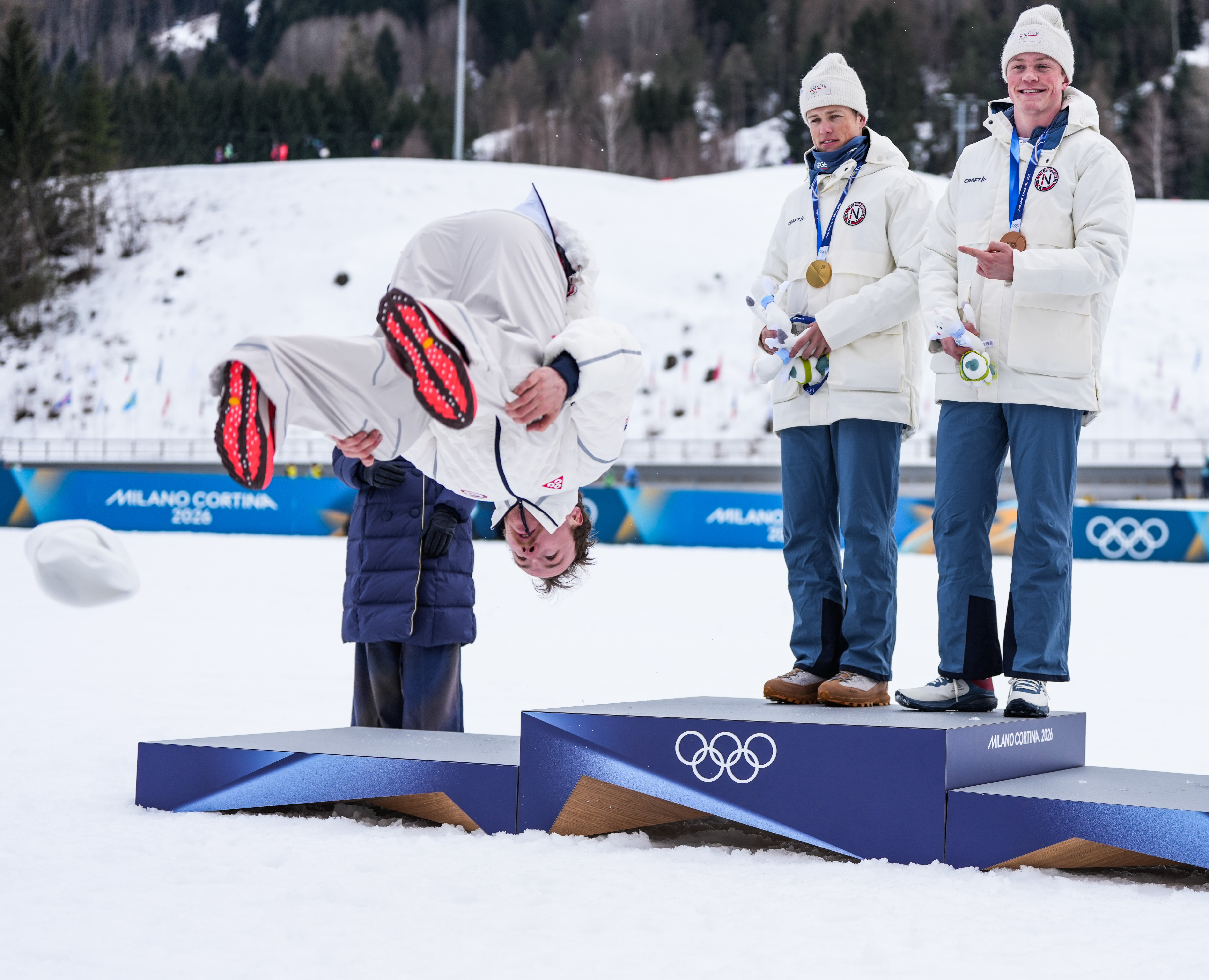 2月10日,亚军好意思国选手奥格登在越野滑雪男人个东说念主短距离(传统本领)受奖庆典上饰演后空翻。新华社记者 彭子洋 摄