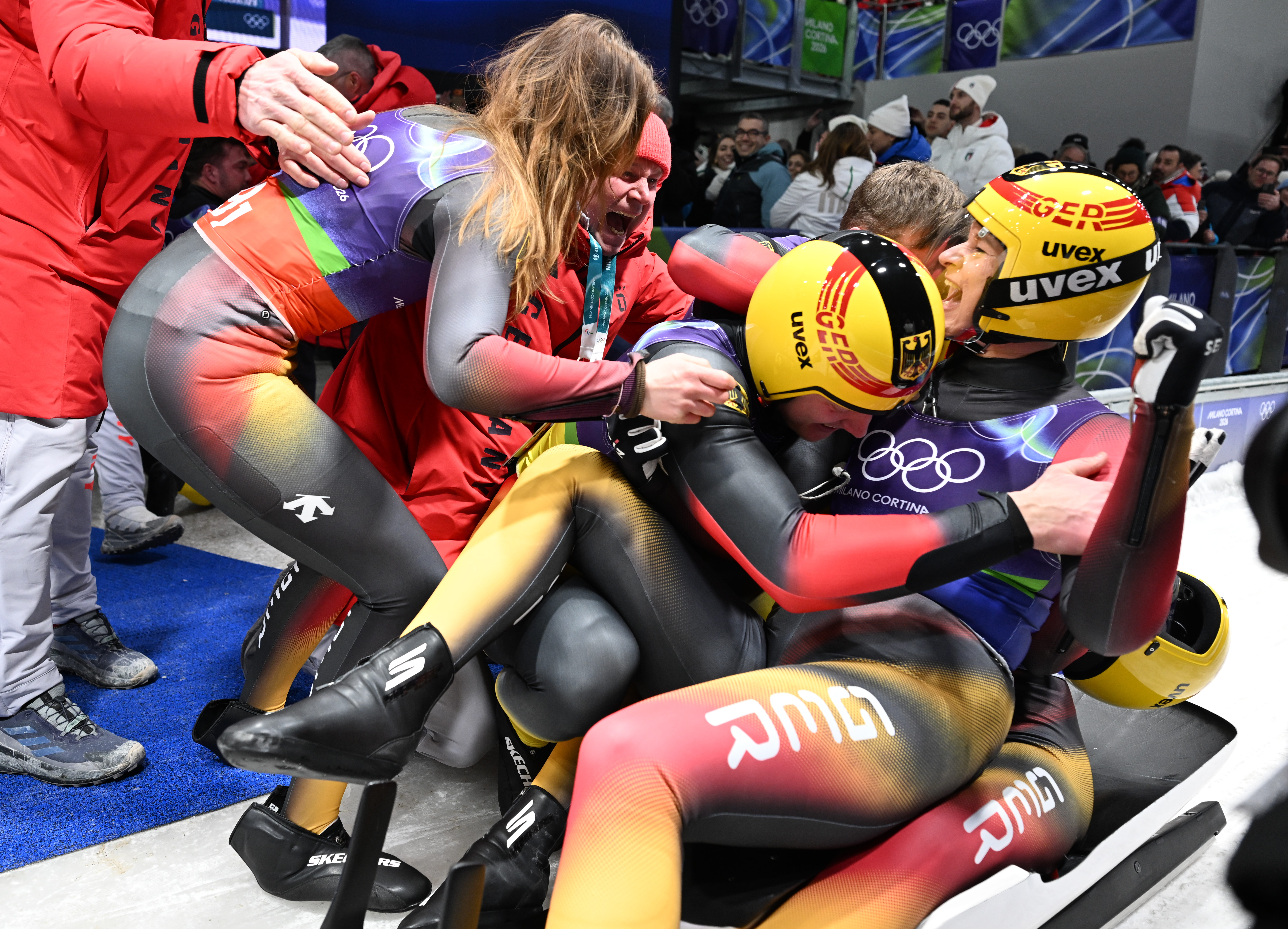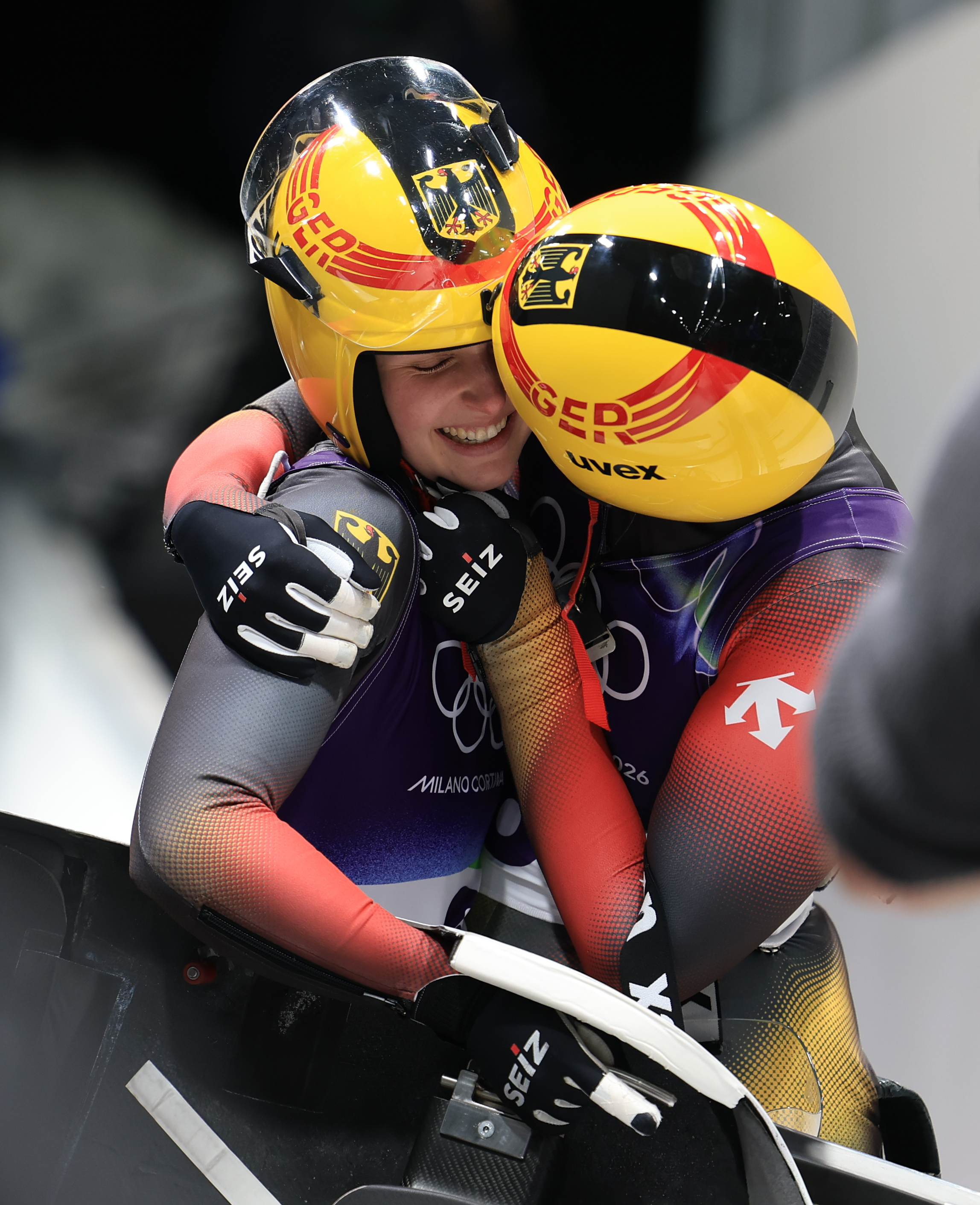 2月11日,德国选手达亚娜/玛格达莱娜在雪橇女子双东说念主赛后庆祝。新华社记者 丁旭 摄