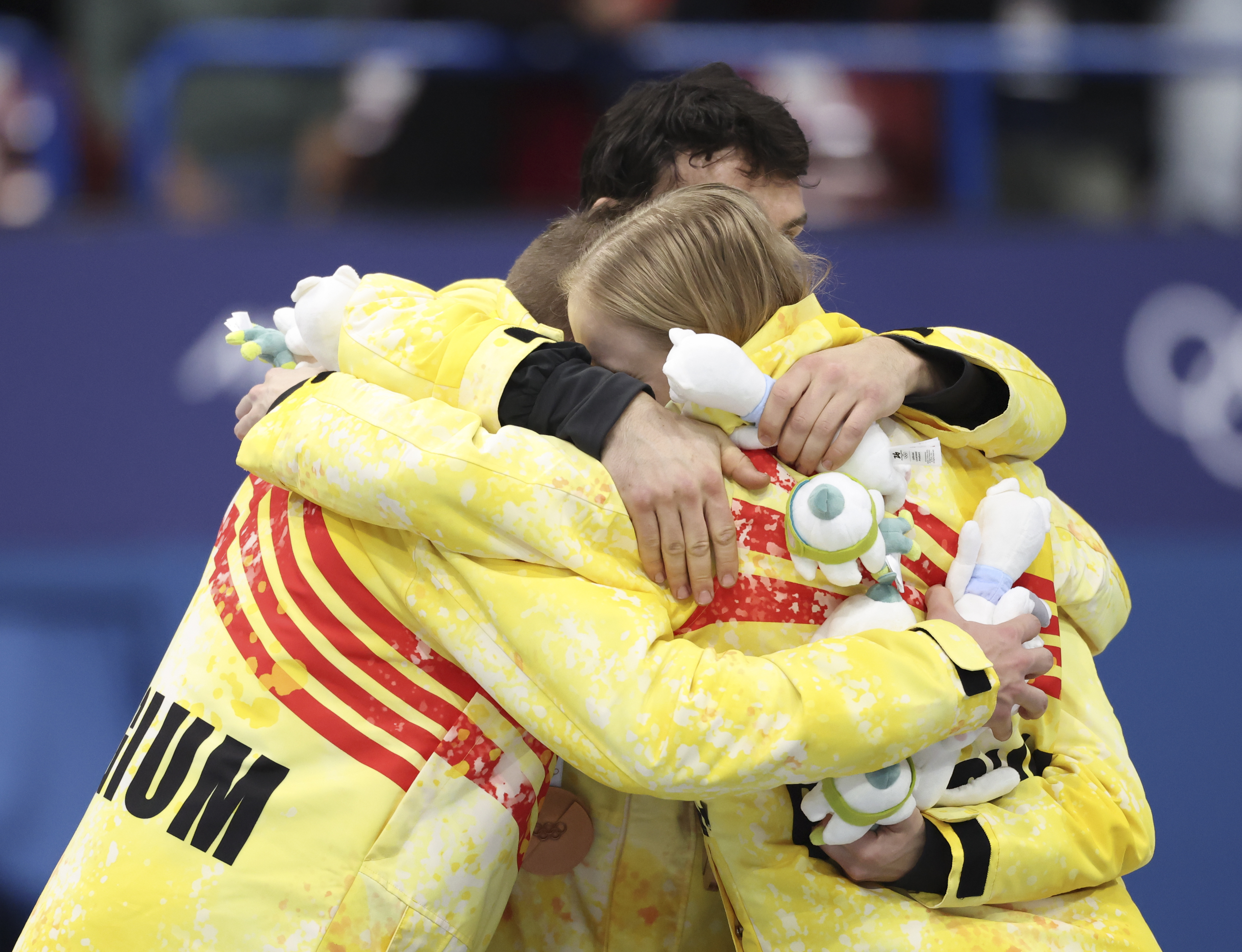 2月10日,季军比利时队在短说念速滑羼杂团体戮力受奖庆典上庆祝。新华社记者 李明 摄