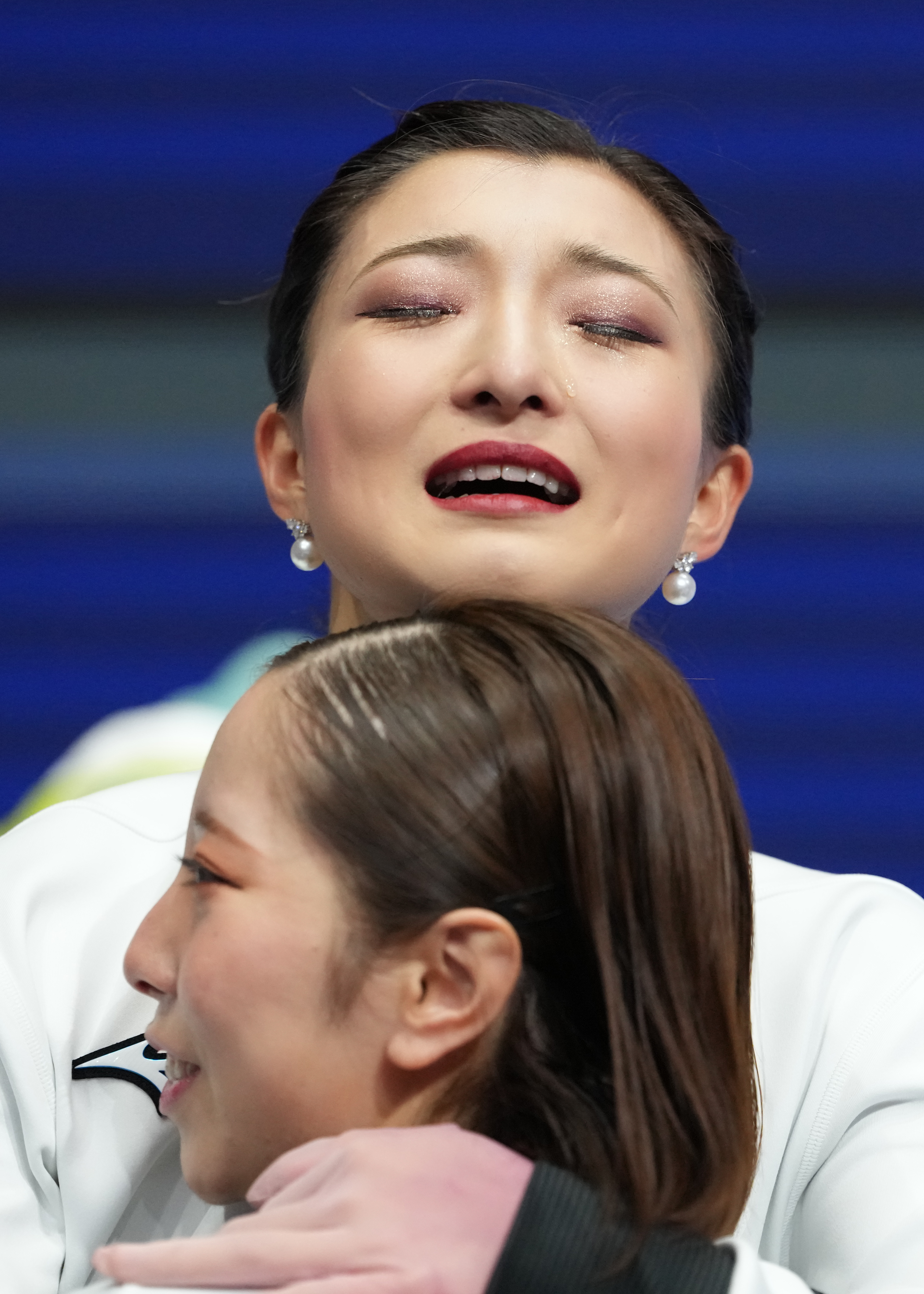 2月8日,日本队选手坂本花织(上)在格式溜冰团体赛女单解放滑比赛后。新华社记者 薛宇舸 摄