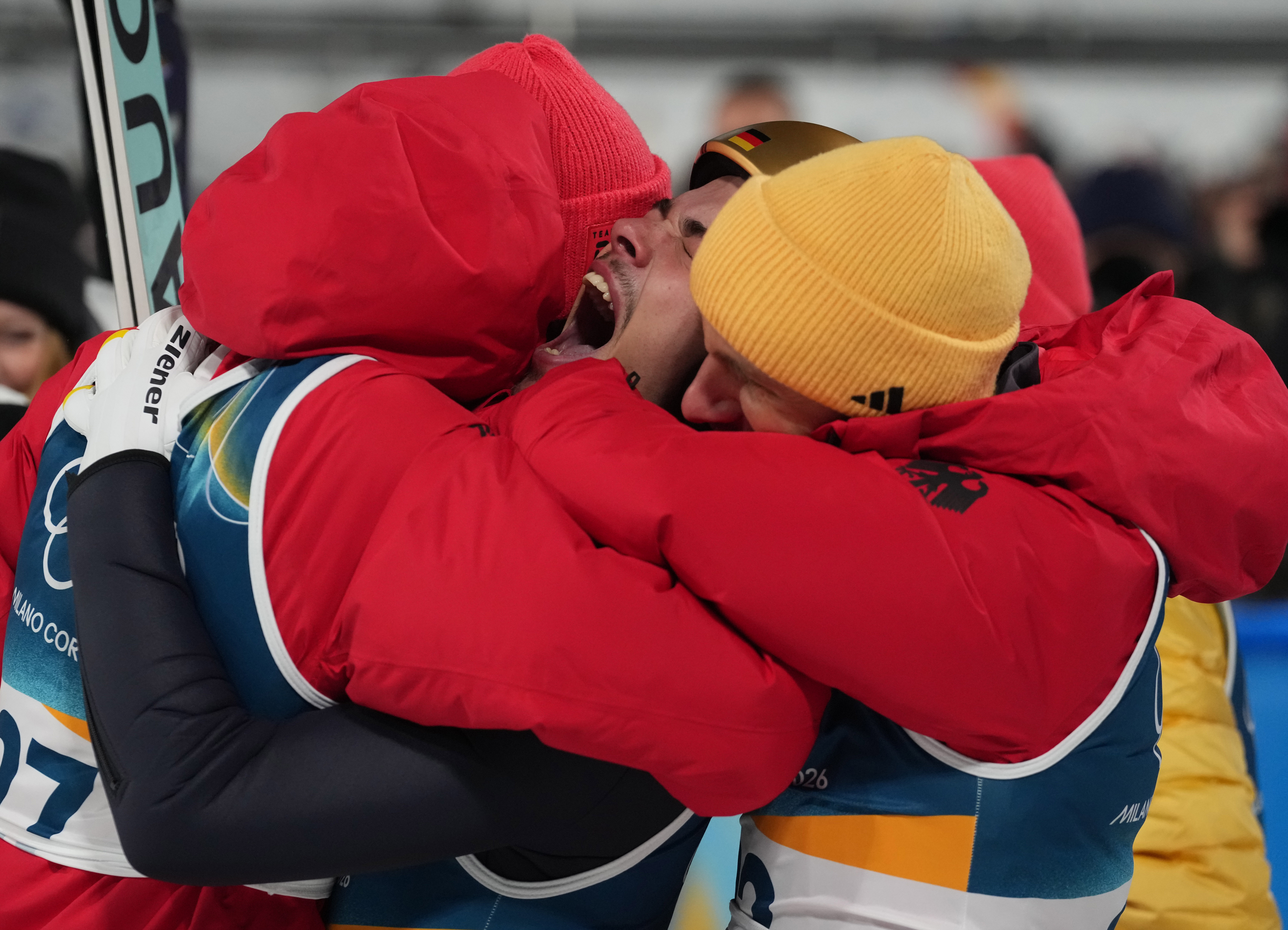 2月9日,冠军德国选手菲利普·雷蒙德(中)在跳台滑雪男人个东说念主步调台比赛后庆祝。新华社记者 孟永民 摄