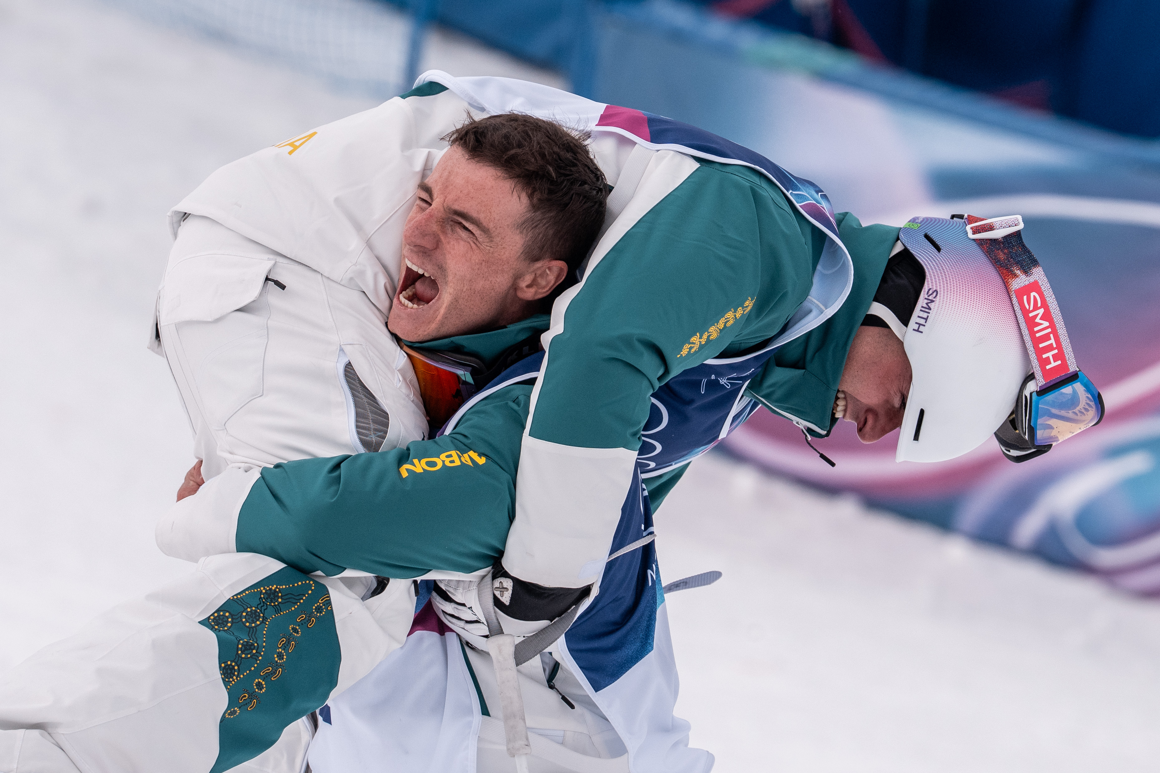 2月12日,好意思国选手鲍姆格特纳(右)和法国选手肖莱在单板滑雪男人欺压追赶小决赛后拥抱。新华社记者 邬惠我 摄