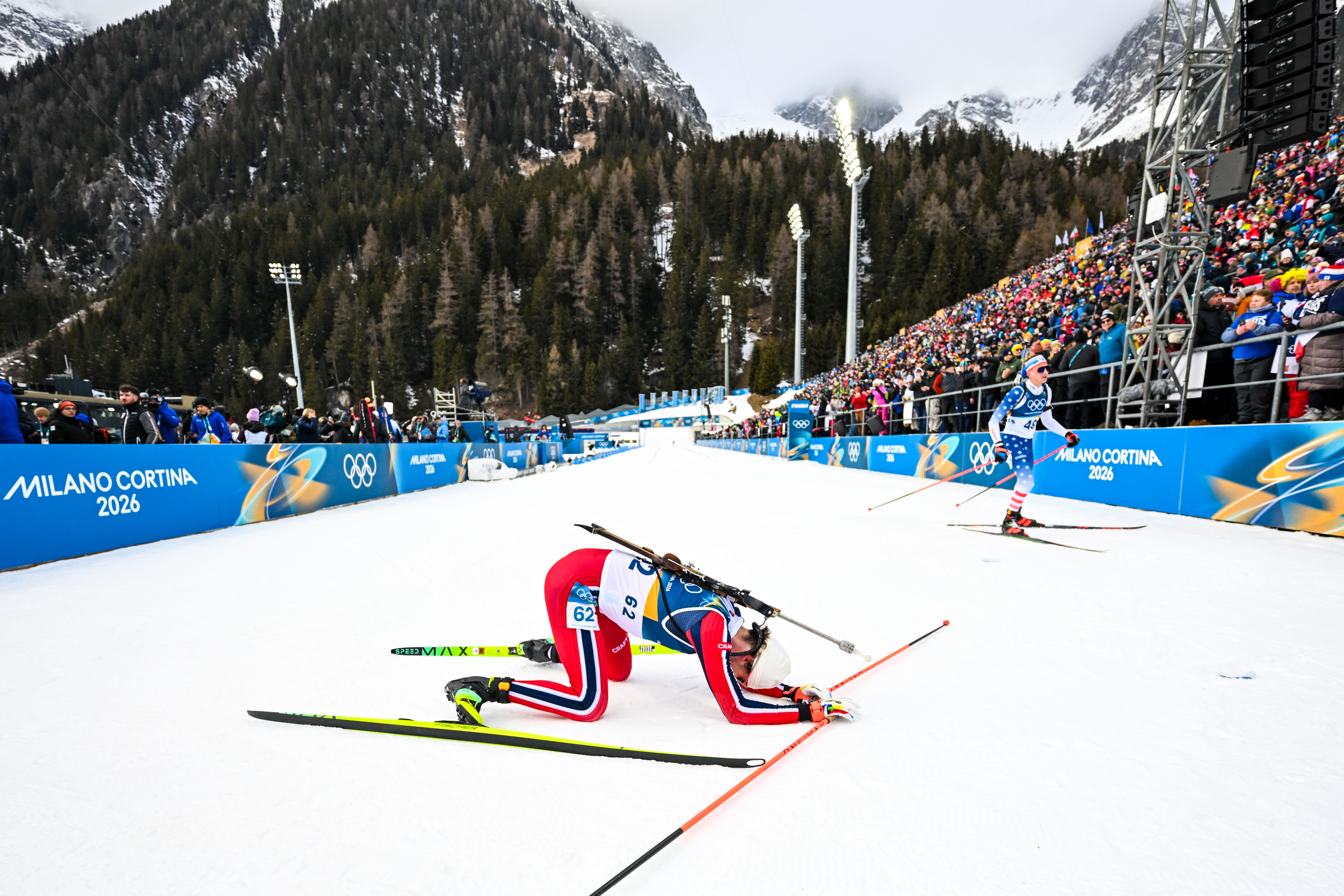 2月10日,挪威选手斯图拉·霍尔姆·莱格雷德(前)在冬季两项男人20公里个东说念主赛冲线后倒地。新华社记者 江汉 摄