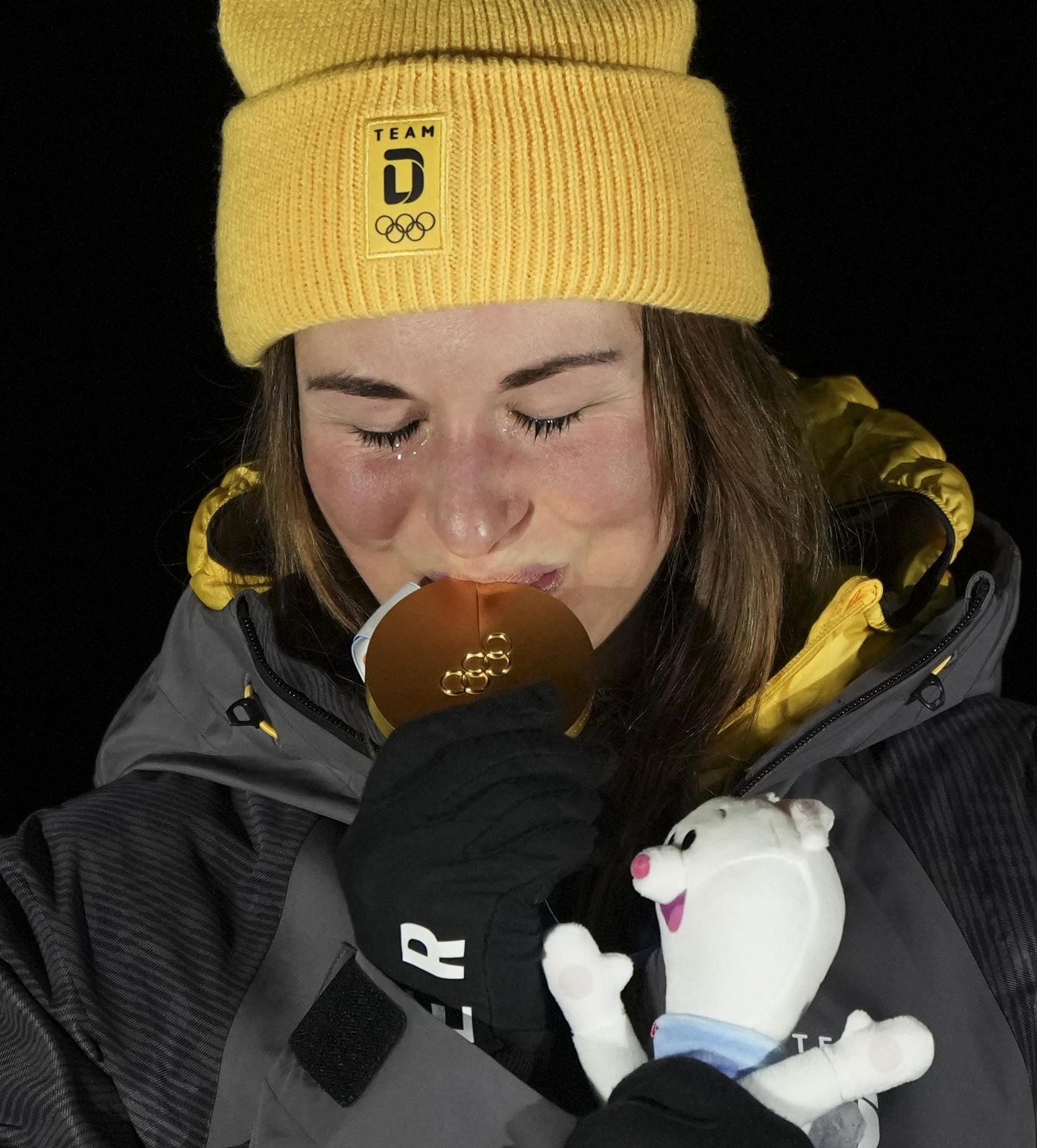 2月10日,冠军德国选手陶比茨在雪橇项目女子单东说念主赛受奖庆典上。新华社记者 李钢 摄