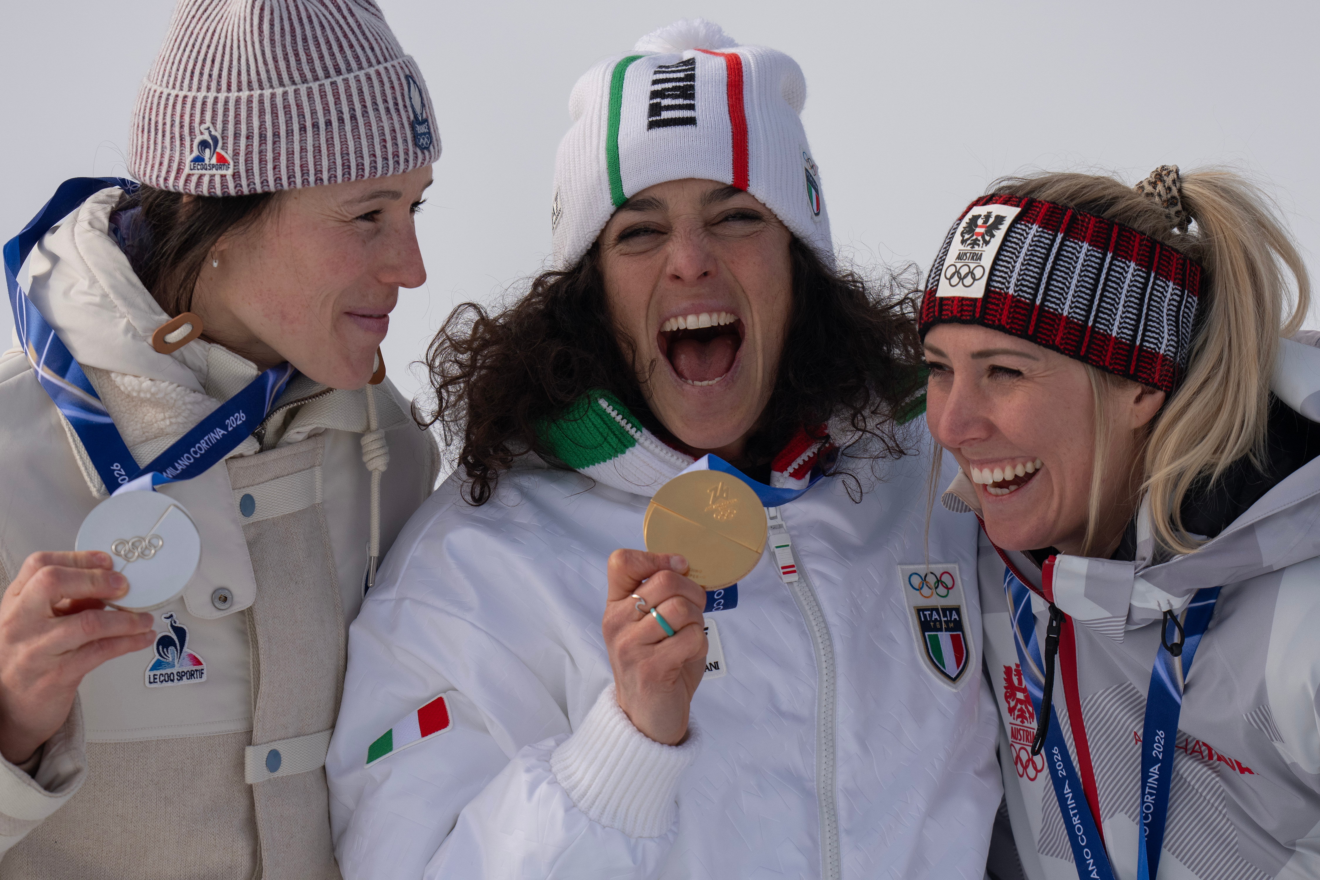 2月12日,冠军意大利选手费代丽卡·布里尼奥内(中)、亚军法国选手罗马娜·米拉多利(左)和季军奥地利选手科尔内利娅·许特尔在峻岭滑雪女子超等大反转受奖庆典上。新华社记者 费茂华 摄