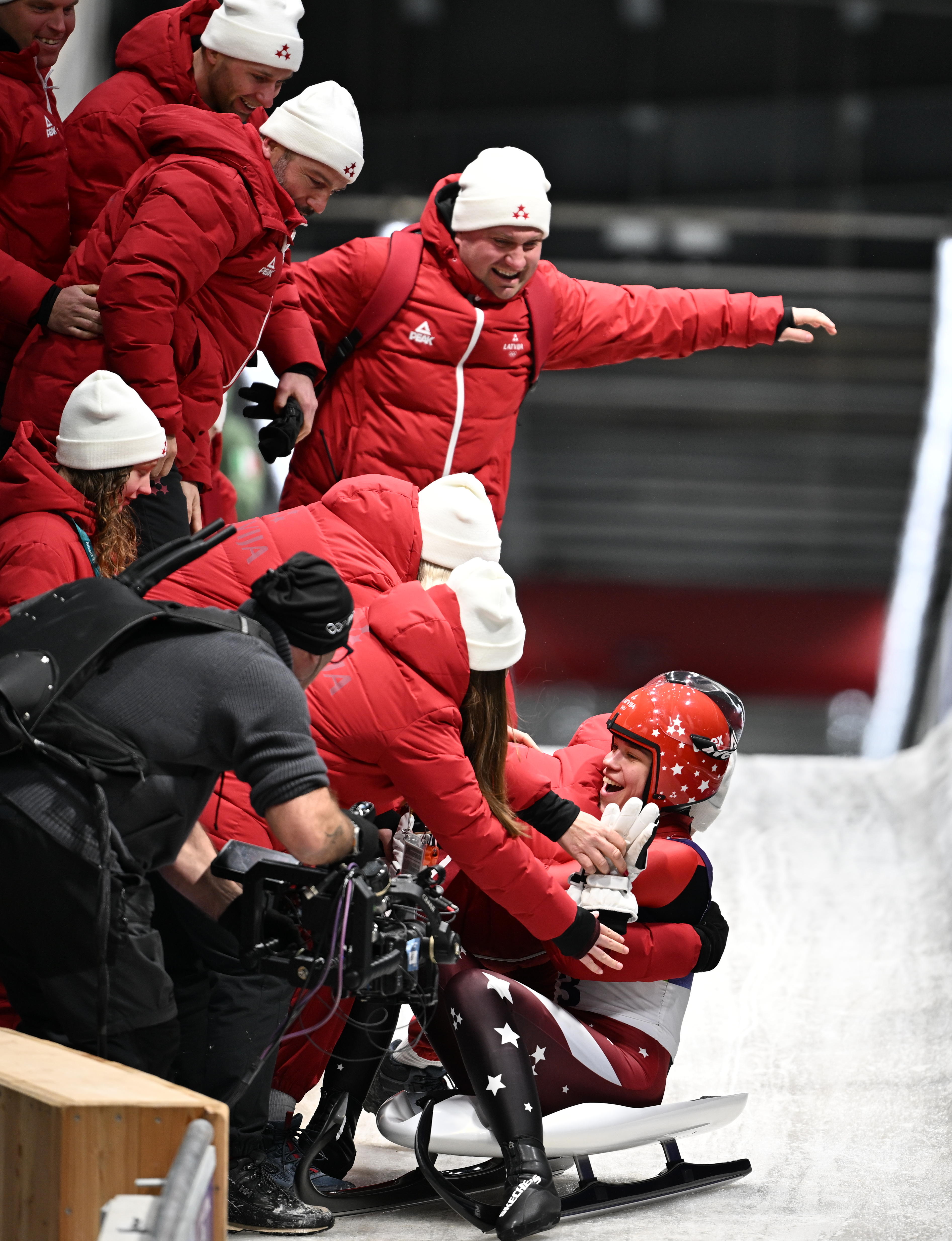 2月10日,拉脱维亚选手博塔(后)在雪橇项目女子单东说念主赛后庆祝。新华社记者 连漪 摄