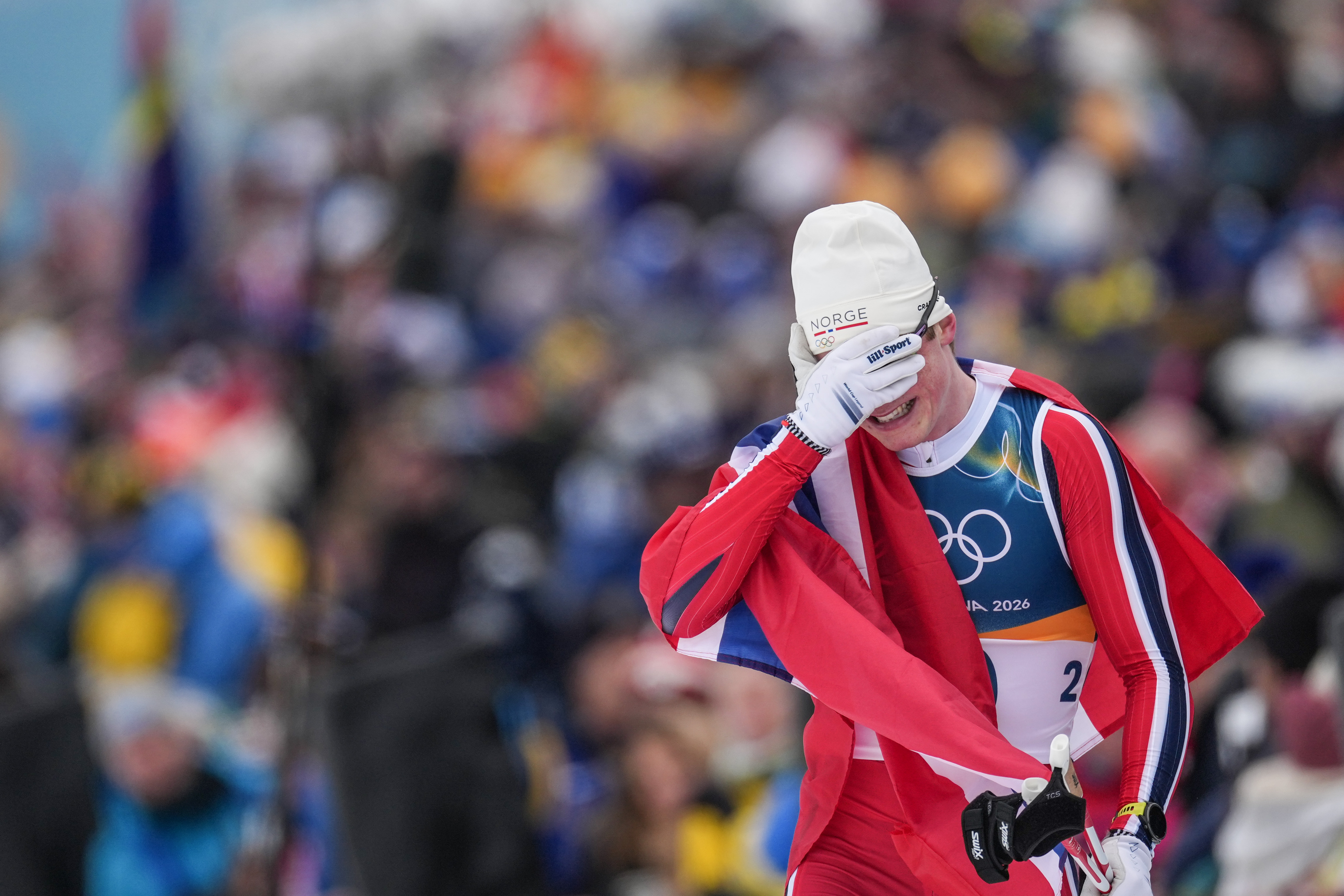 2月10日,挪威选手维凯在越野滑雪男人个东说念主短距离(传统本领)决赛后掩面而泣。新华社记者 彭子洋 摄