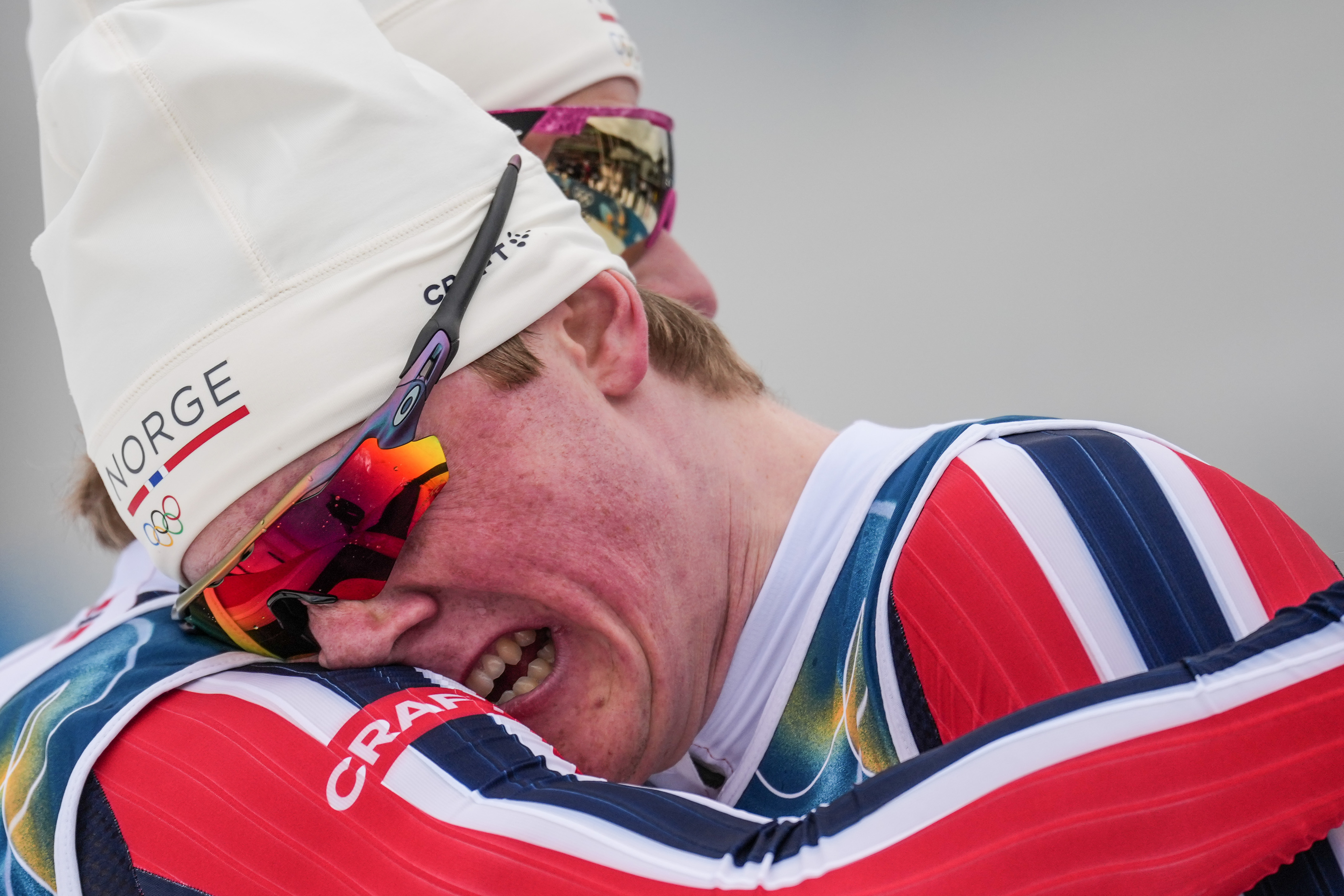2月10日,赢得越野滑雪男人个东说念主短距离(传统本领)季军的挪威选手维凯(右)与赢得冠军的队友克莱博拥抱时喜极而泣。新华社记者 彭子洋 摄