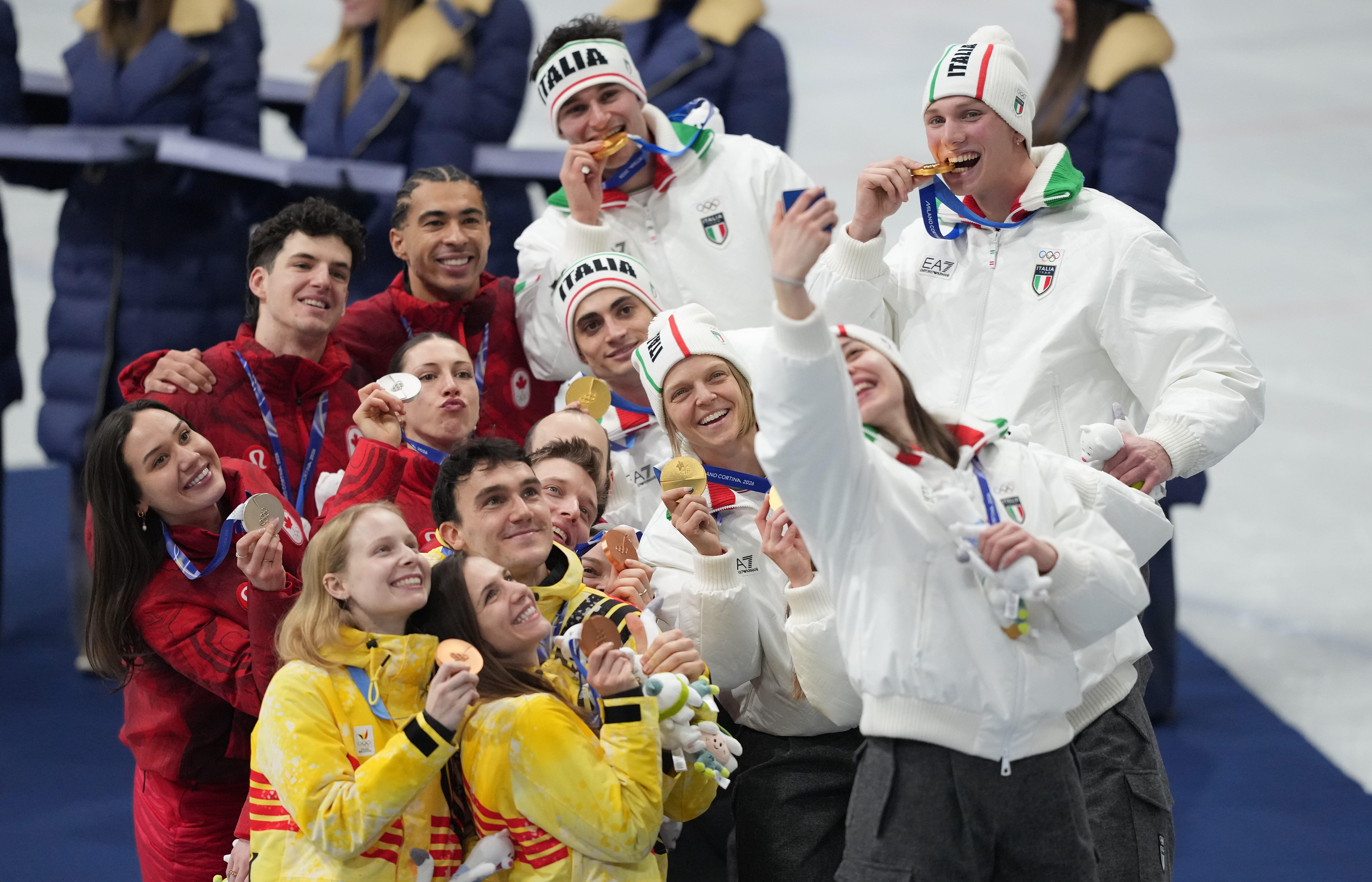 2月10日,冠军意大利队(右)、亚军加拿大队(左上)和季军比利时队在短说念速滑羼杂团体戮力受奖庆典上合影。新华社记者 薛宇舸 摄