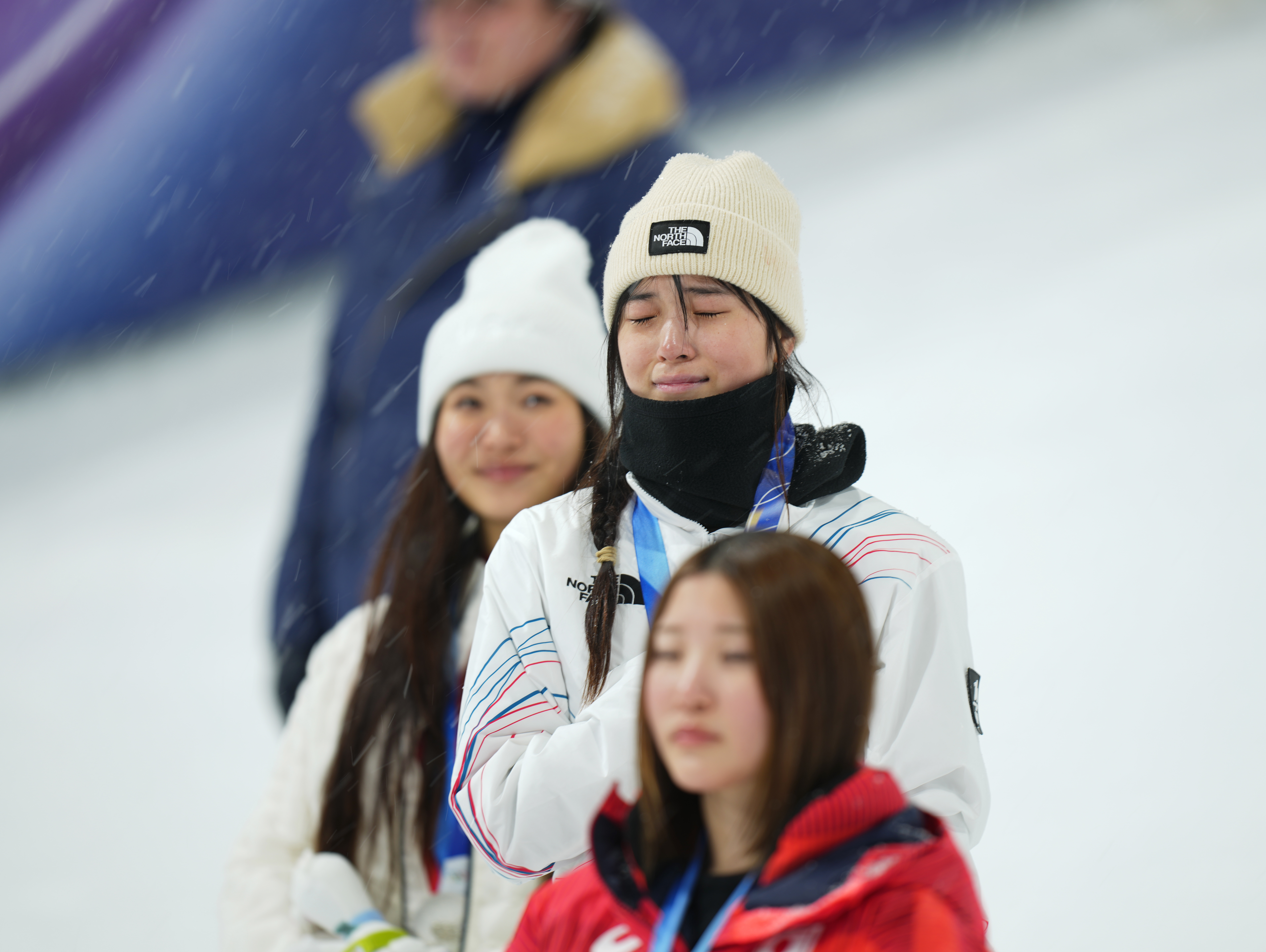 2月12日,韩国选手崔佳温(中)在米兰冬奥会单板滑雪女子U型方位手段决赛受奖庆典上。新华社记者 夏一方 摄