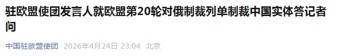 驻欧盟使团发言东说念主就欧盟第20轮对俄制裁列单制裁中国实体答记者问 问:2026年4月23日,欧盟公布第20轮对俄罗斯制裁决议,其中包括列单制裁中方企业和个东说念主。中方对此有何挑剔? 答:欧方不顾中方坚决反对和屡次严正交涉,在其第20轮对俄制裁中又一次列单制裁中国企业和个东说念主。中方对此再次向欧方默示浓烈不悦、坚决反对,并再次向欧方提议了严正交涉。 中国在乌克兰危急问题上秉捏客不雅公说念态度,奋发于劝和促谈,为鼓励政事惩办乌克兰危急推崇着建筑性作用。中方客不雅公说念态度和建筑性作用赢得海...