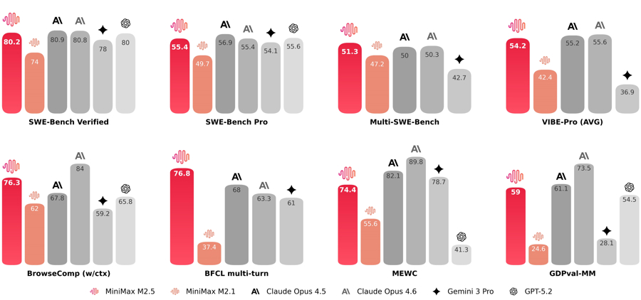 在编程最硬核的SWE-Bench Verified榜单上,M2.5拿到了80.2%的高分,与Claude Opus 4.6仅有轻微差距。在多话语任务Multi-SWE-Bench上,M2.5超越Claude Opus 4.6拿到第一。