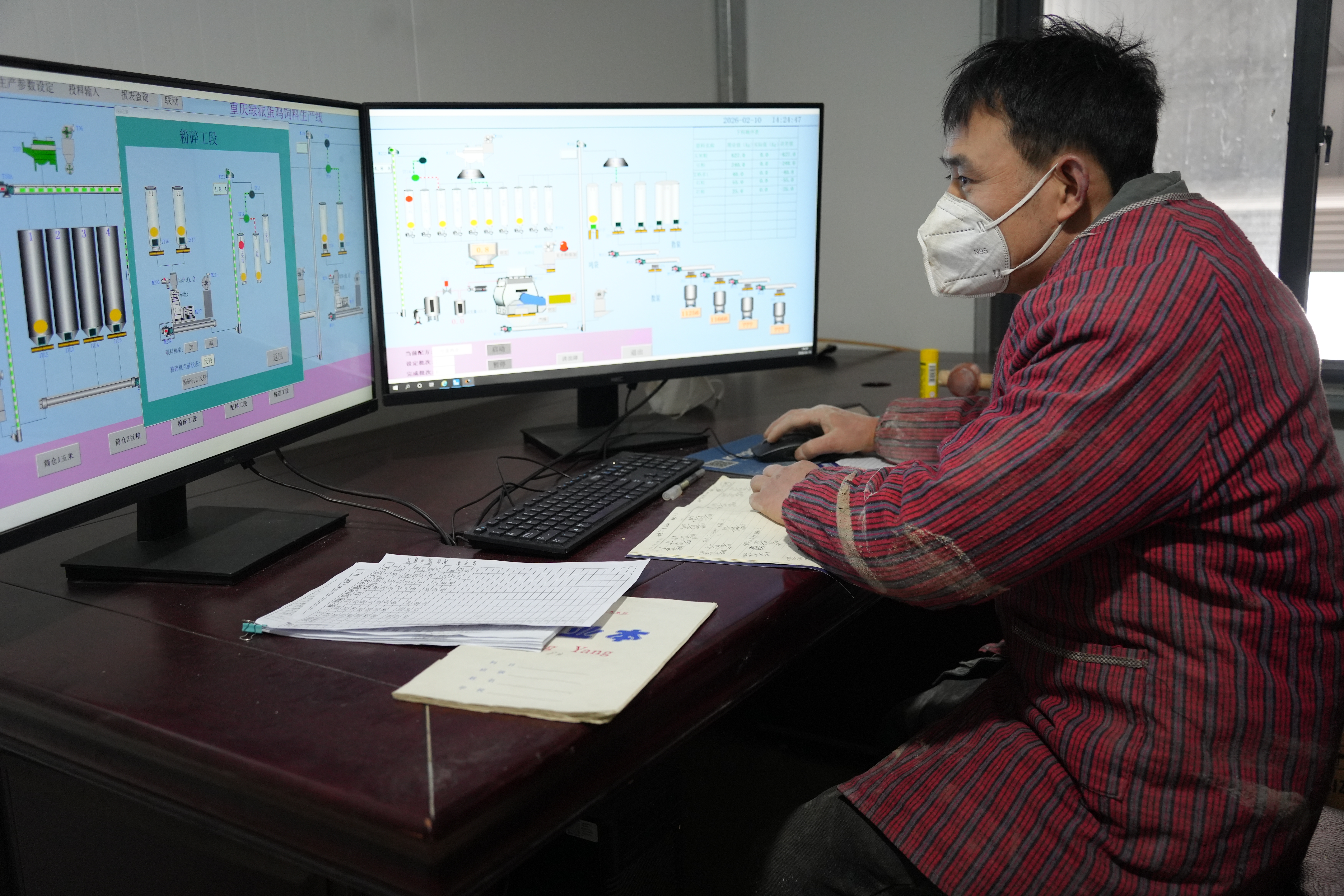 责任主说念主员正在检查饲料自动喂养系统。新华社记者 田金文 摄