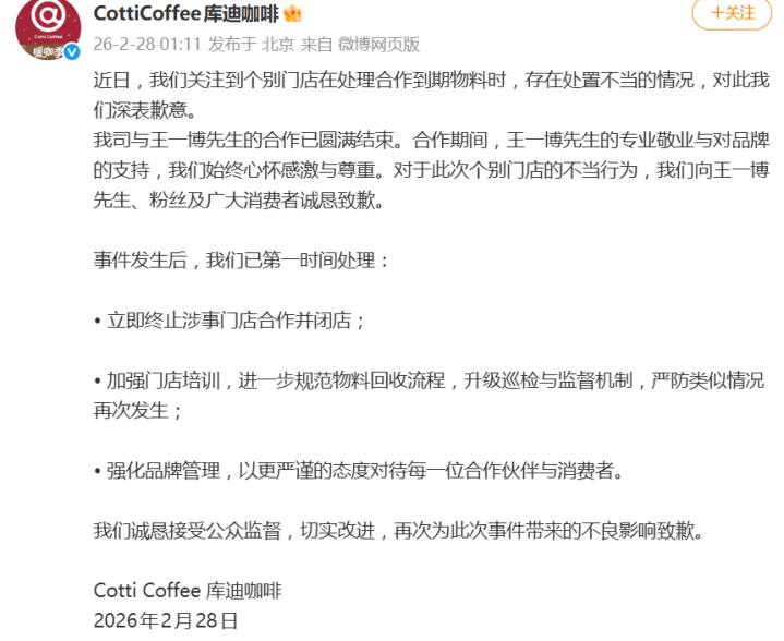 面临抓续发酵的公论压力,库迪咖啡在2月28日凌晨发布了完竣的致歉声明。声明中,品牌承认个别门店在处理合营到期物料时存在管制失当的情况,向王一博先生、粉丝及弘大破钞者本分致歉,同期明确暗示,与王一博先生的合营已圆满适度,关于合营时期王一博先生的专科敬业与对品牌的补助,永久心胸谢忱与尊重。针对这次事件,品牌也同步公布了三项中枢处理步调:立即阻隔涉事门店合营并闭店;加强门店培训,进一步表率物料回收历程,升级巡检与监督机制,戒备肖似情况再次发生;强化品牌管制,以更严谨的魄力对待每一位合营伙伴与破钞者。声明终末,品牌暗示将本分经受公众监督,切实改动,再次为这次事件带来的不良影响致歉。