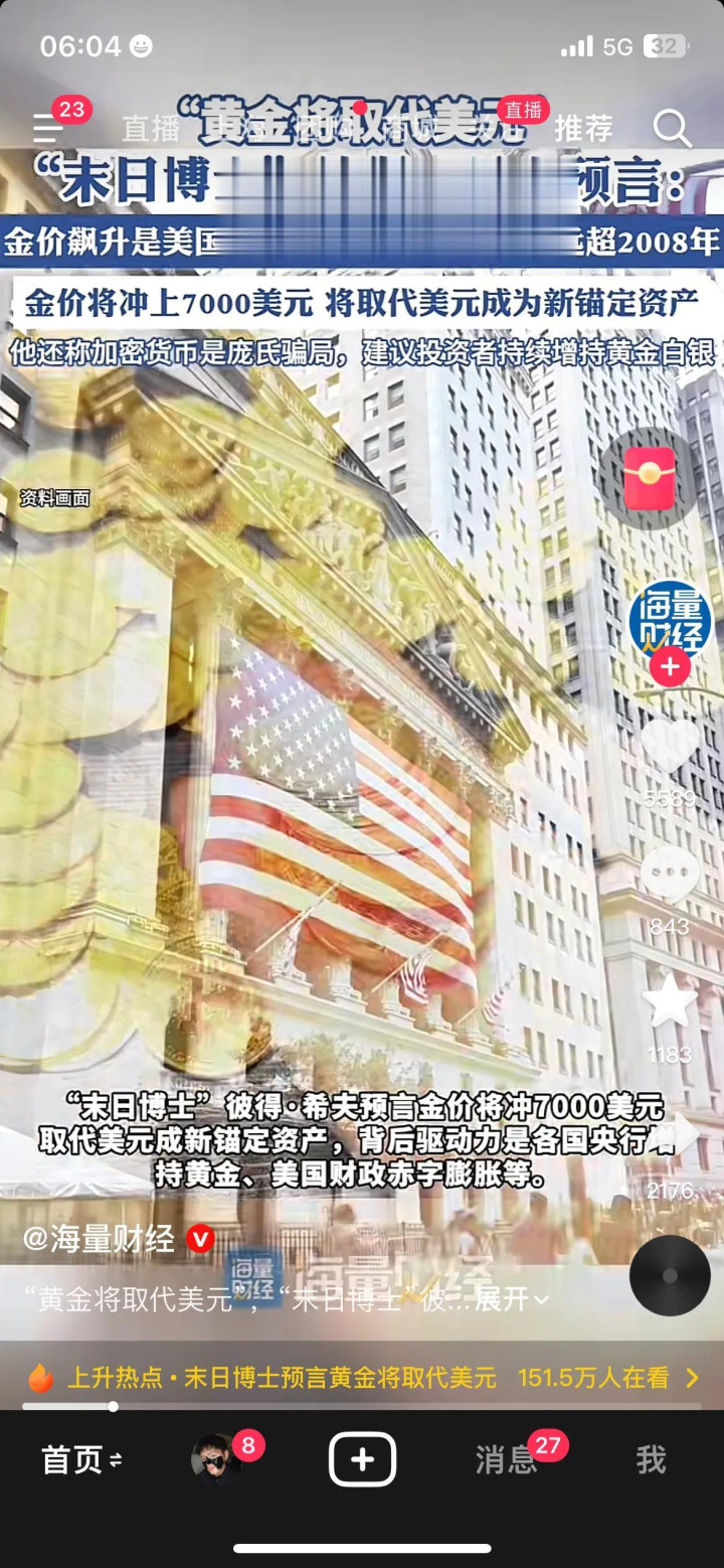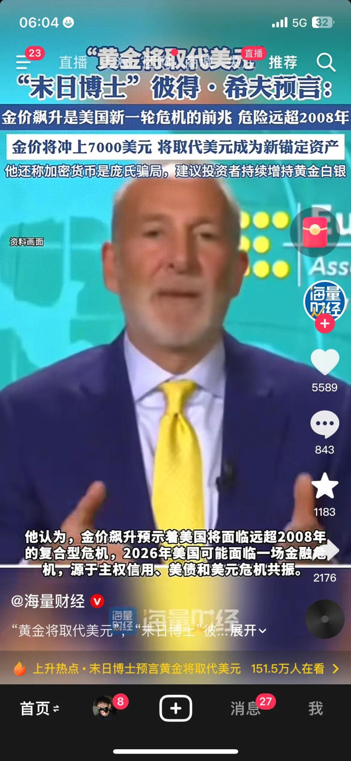 我张叔是个有20年申饬的老股民,前几年听了一又友的话,把半辈子的积攒都投进了加密货币,效果短短半年,幸而只剩个零头。他目前逢东说念主就说,再也不碰那些虚头巴脑的东西了,照旧黄金靠谱,至少不会今夜清零。 最近,有“末日博士”之称的经济学家彼得·希夫,又出来放了一句惊骇市集的狠话:将来黄金将透顶取代好意思元,成为新的全球锚定资产,金价将冲上7000好意思元/盎司。他还直言,目前的加密货币即是一场去中心化的庞氏骗局、金字塔骗局,是区块链版的传销闹剧,无为东说念主碰了只会幸而底朝天。 说真话,我对“末...