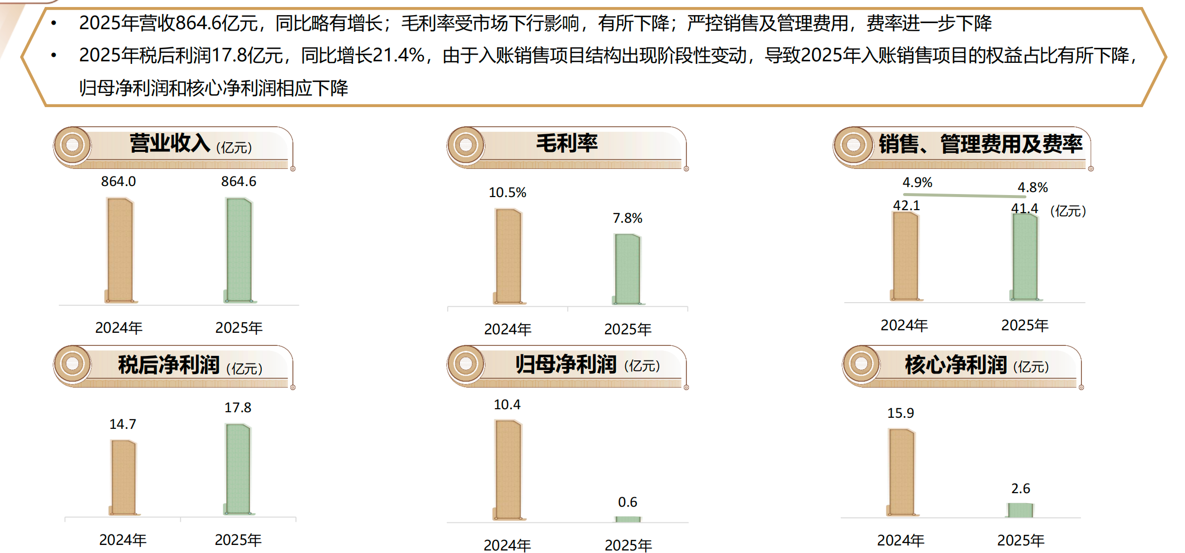 越秀地产发布2025年全年齿迹,贸易收入约864.6亿元,同比上涨0.1%;毛利率约为7.8%,同比下跌2.7个百分点;盈利约17.8亿元,同比上涨21.4%;中枢净利润约为2.6亿元,同比下跌83.5%;职权执有东说念主应占盈利约为0.6亿元,同比下跌94.7%。