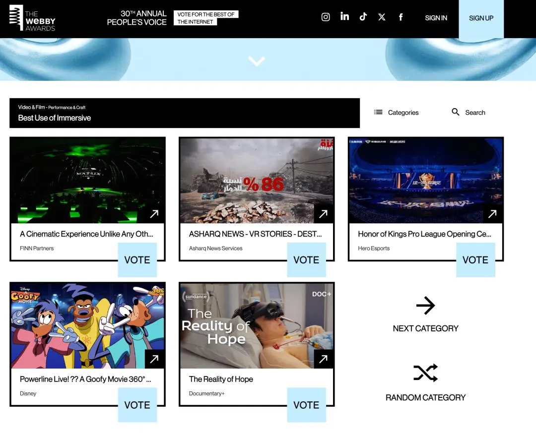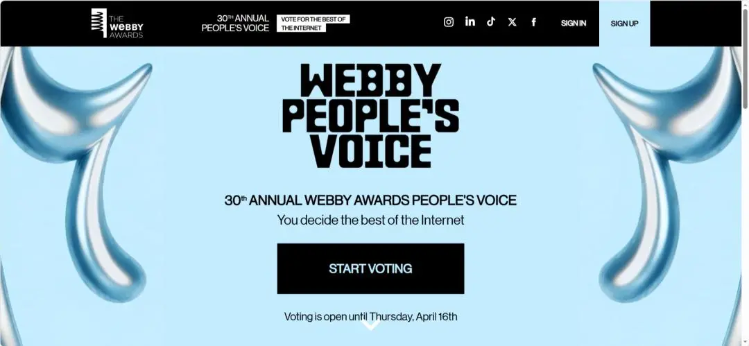 与此同期,威比奖也保留了一个很有互联网气质的特征:它并不把专科判断与公众参与十足割裂。每个类别既有由学院评出的Webby Award,也有由公众投票选出的People’s Voice Award。前者代表行业里面的招供,后者则给了作品在更庸俗传播层面被接头、被扩散的空间。