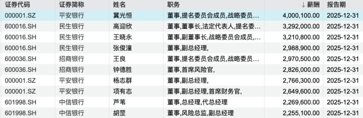 “百万薪酬”队伍中,还有民生银行董事长高迎欣,薪酬为329.2万元;民生银行副董事长、行长王晓永,薪酬为321.08万元;民生银行副行长张俊潼,薪酬为298.89万元;招商银行行长王良,薪酬为297.05万元;自2026年2月13日起上任邮储银行行长及本质董事的芦苇,2025年在中信银行赢得的薪酬为226.96万元。