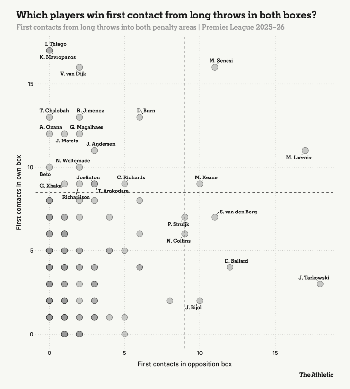 前卫让队友去争夺对方禁区的第一落点并不一定奇怪——比如说,像迪福或欧文也会如斯。但他们不会成为定约中最好的贯注界外球突围的球员。换句话说,布伦特福德在界外球中最好的紧要球员是后卫,而他们最好的贯注球员是他们的主力前卫。