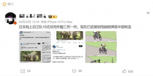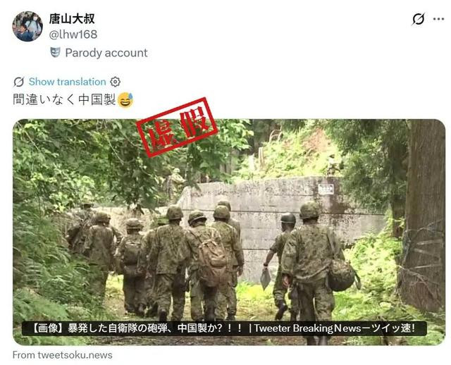 4月21日,tweetsoku.news发布了实践为“[图片]自保队那枚哑火炮弹是中国制造的吗?!”的帖文,并配上了一张士兵在旷野走路的图片。除了图片外,帖文并未给出更多不错佐证说法的笔墨信息或细节字据。