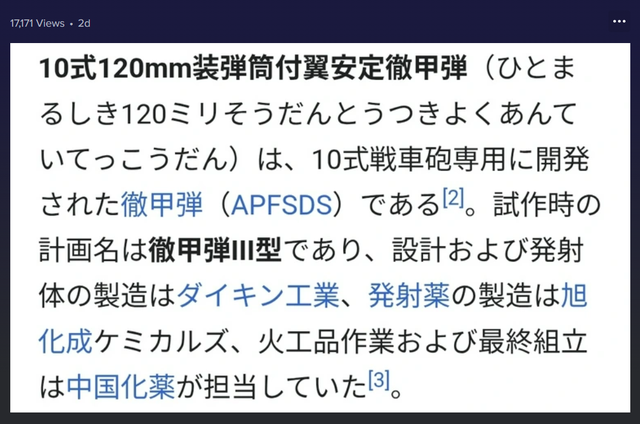 在这一帖文的下方评述区,有网友发布了一条图片领略,实践指向一段来自维基百科的笔墨:“10式120毫米尾翼瓦解脱壳穿甲弹是专为10式坦克炮研制的一种穿甲弹(APFSDS)。原型弹被定名为Ⅲ型穿甲弹,其瞎想及弹体制造由大金工业持重,鼓动剂的分娩由旭化成化学工业持重,人烟安设及最终拼装则由中国化药持重。”